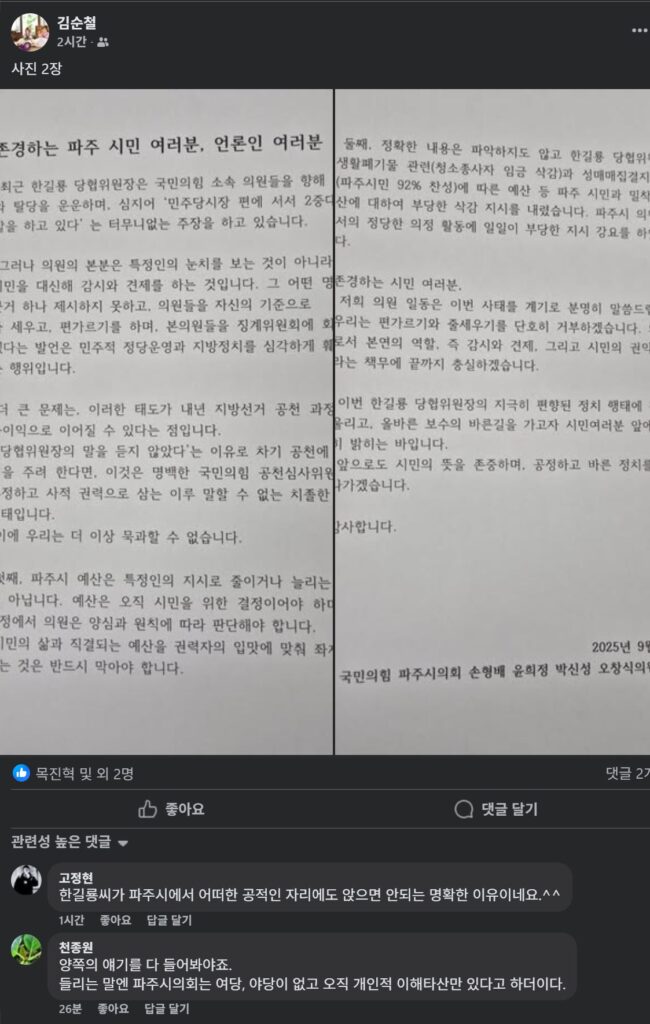 ‘파주시의회 민주주의 수호 결의안 ‘ 에 반대를 한 국민의힘 소속 시의원 4명이 2025.9.15일 페이스북을 통해 한길룡 당협위원장을 비판하는 성명서를 발표했다. -파주위키-