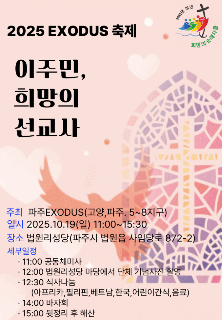 파주EXODUS는 2025년 10월 19일(일) 오전 11시부터 오후 3시 30분까지 파주시 법원읍 사임당로 872-2 소재 법원리성당에서 ‘이주민, 희망의 선교사’를 주제로 한 2025 EXODUS 축제를 개최한다.