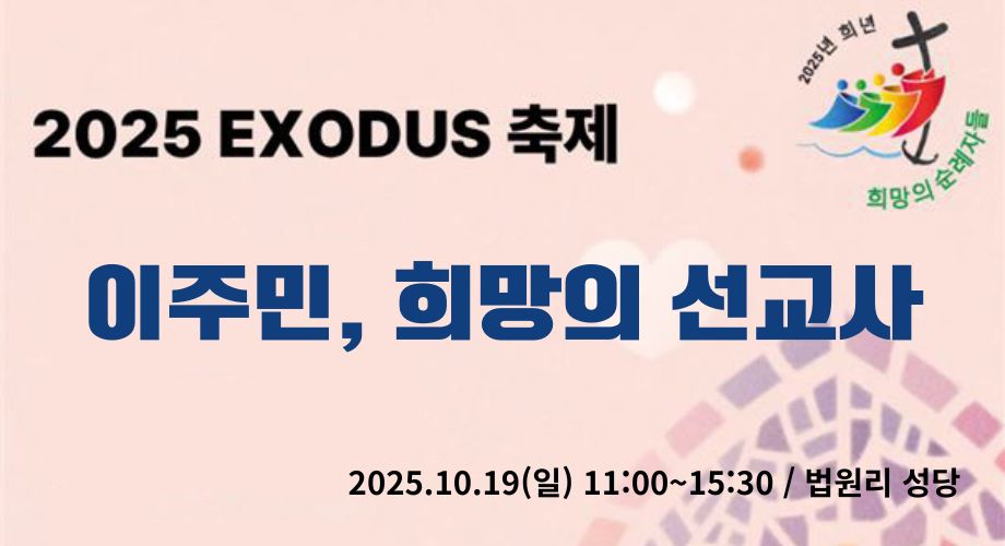 파주EXODUS는 2025년 10월 19일(일) 오전 11시부터 오후 3시 30분까지 파주시 법원읍 사임당로 872-2 소재 법원리성당에서 ‘이주민, 희망의 선교사’를 주제로 한 2025 EXODUS 축제를 개최한다.