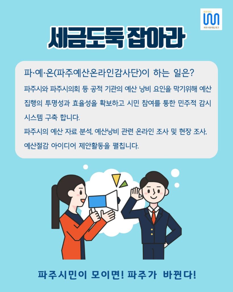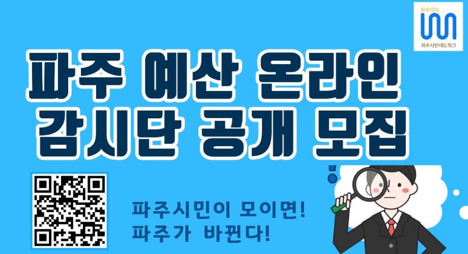 파주시 예산 집행의 투명성과 효율성을 높일 시민 감시단을 모집합니다! 지역 현안에 관심 있는 파주 시민이라면 누구나 참여 가능합니다. 온라인 활동을 통해 우리 시의 예산을 함께 지켜주세요!