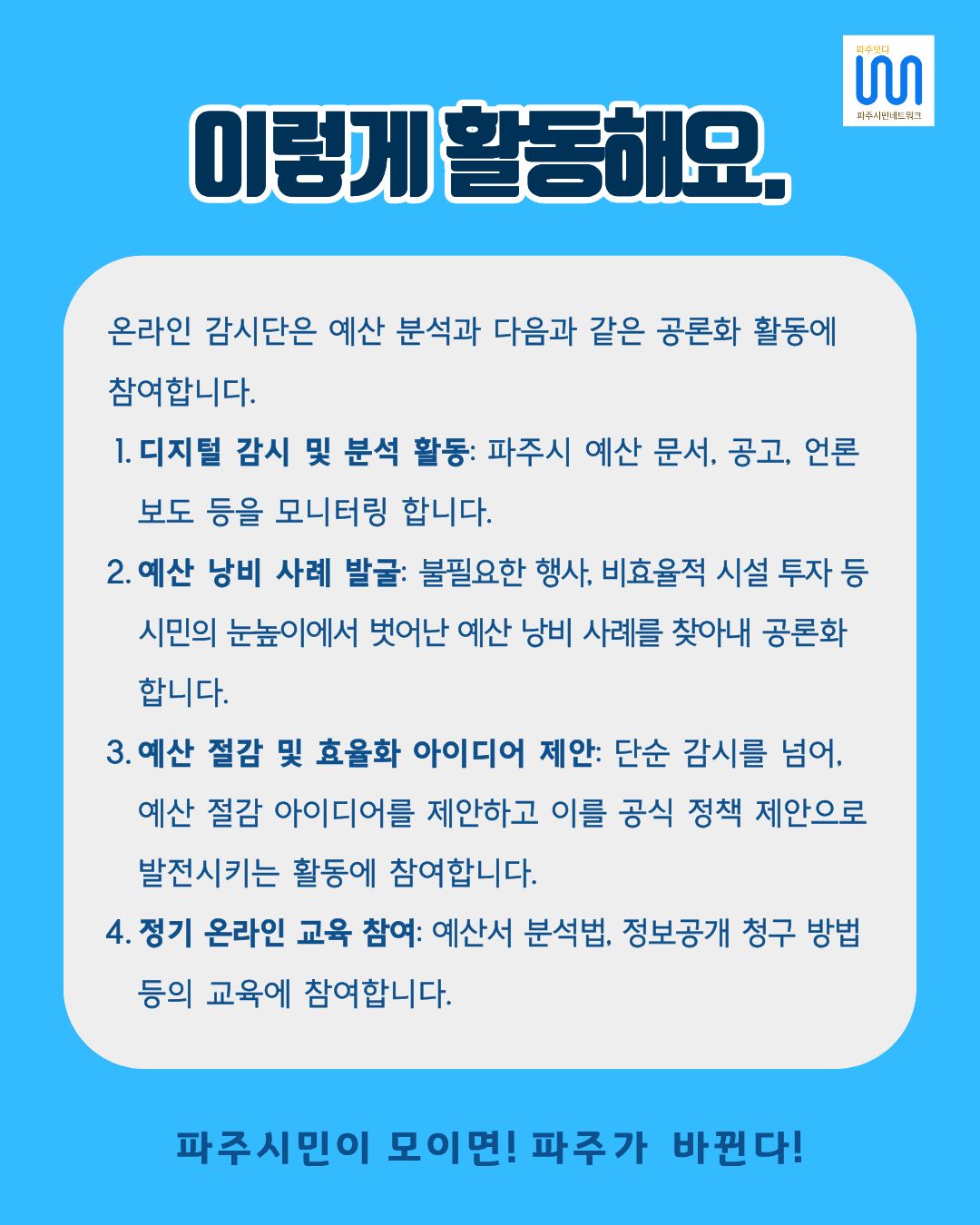 파주시 예산 집행의 투명성과 효율성을 높일 시민 감시단을 모집합니다! 지역 현안에 관심 있는 파주 시민이라면 누구나 참여 가능합니다. 온라인 활동을 통해 우리 시의 예산을 함께 지켜주세요!