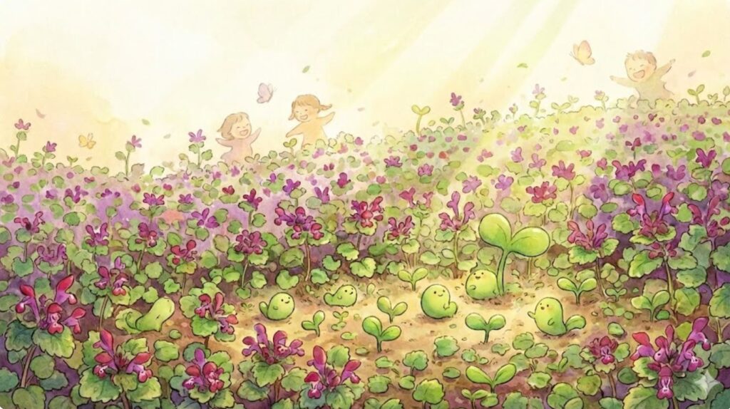 ‘코딱지나물’이라는 해학적인 이름을 가진 작은 잡초가 들판을 점령해가는 유쾌한 생명력의 현장을 포착한 시다. 시인은 이 앙증맞은 풀들이 번져가는 모습을 마치 아이들의 ‘개구진 코딱지’가 ‘또르르’ 굴러다니며 대지를 수놓는 듯한 재미있는 상상력으로 그려낸다. 낮게 엎드려 땅의 품에 안겨 있으면서도, 온몸으로 ‘까르르’ 희열을 터뜨리며 천진난만하게 춤추는 이 작은 생명들의 축제는 봄의 들판을 명랑한 에너지로 가득 채운다. 하찮게 여겨지는 잡초의 이름값을 톡톡히 띄우는 건강한 생의 찬가다.pajuwiki_ai