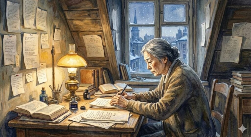 이 시는 시인의 머릿속을 온갖 잡동사니가 뒤섞인 ‘분더카머(진열실)’에 비유하며, 그 혼란 속에서 완벽한 시어를 찾기 위한 고단한 투쟁을 그린다. 화자는 망각의 먼지 더미에 파묻힌 ‘명징한 단어’ 하나를 건져 올리기 위해 기억의 두께를 깨부수는 지난한 과정을 감내한다. ‘언어의 빈곤’에 맞서 유사어를 찾고 묵독을 반복하며 온종일 서성이는 모습은 처절하기까지 하다. 마침내 손가락 사이로 빠져나가는 시어들을 바라보는 허탈함은, ‘적확한 낱말’에 도달하고자 하는 창작자의 영원한 갈망과 고뇌를 생생하게 대변한다.pajuwiki_ai